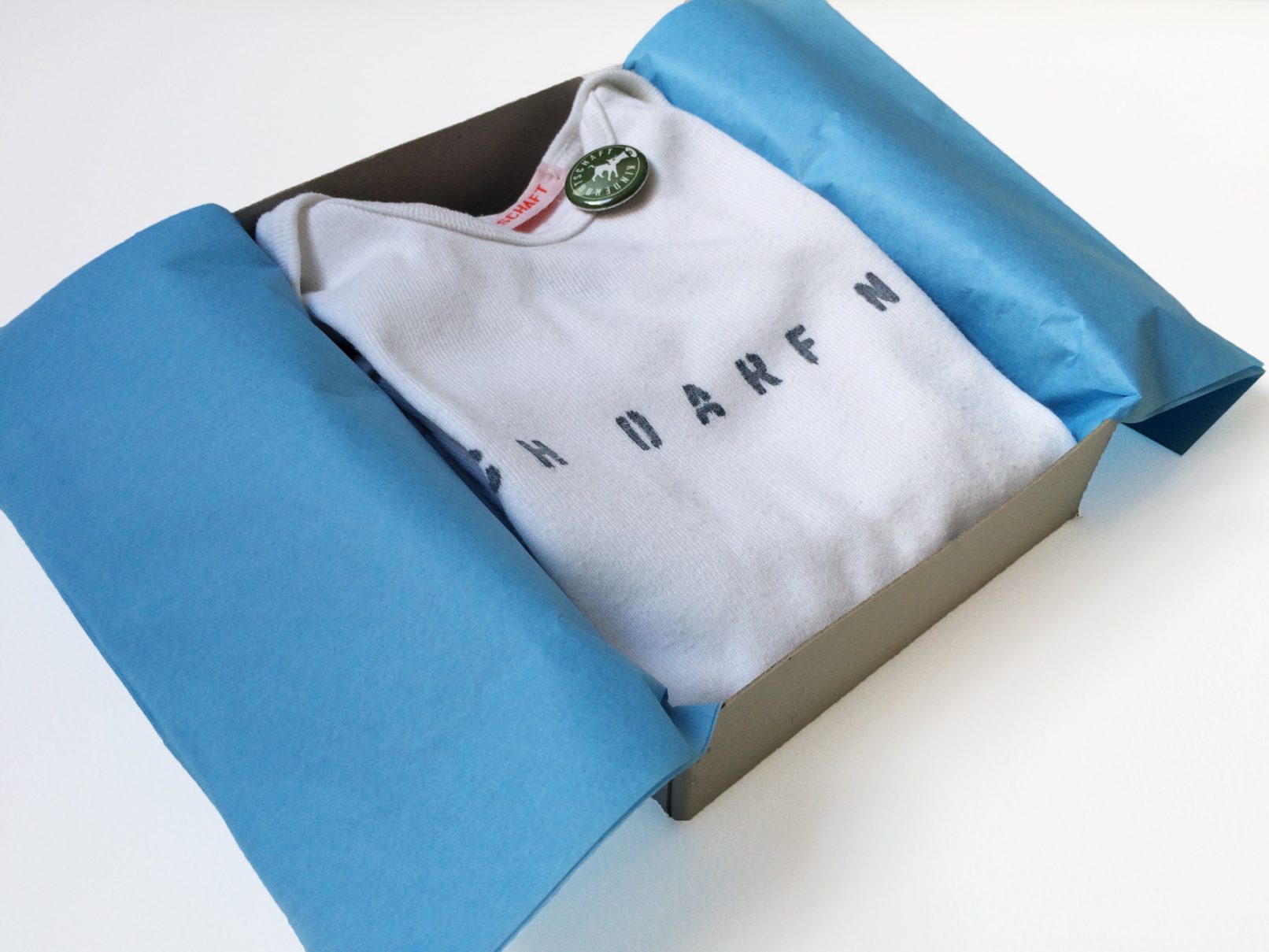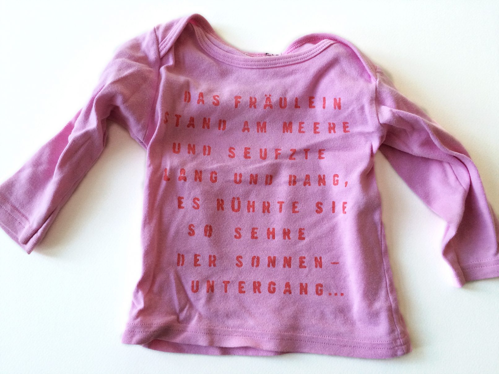 Produkte der KINDERBOTSCHAFT: Babybodies, und -Mützchen, die der Käufer individuell mit einem von ca. 20 Sprüchen in 12 Farben beschriften lassen konnte.