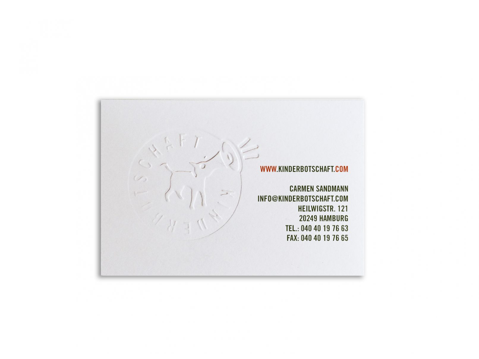 Das farbige Logo und das geprägte Logo auf einer Visitenkarte.